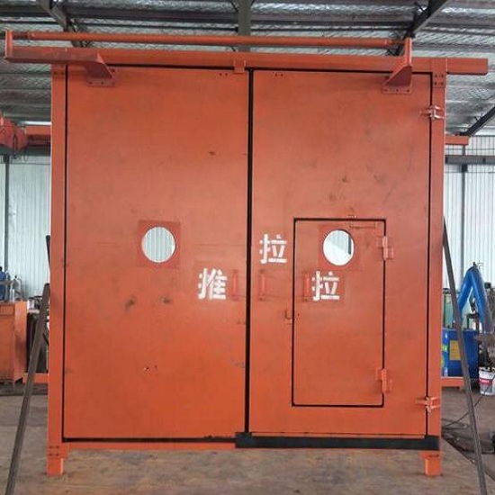 矿用远程自动无压风门的门框安装时底部用门槛连杆连接固定,在门体完全被墙体固定牢固之前务必保证门框内对角尺寸相等;门框固定安装完毕后可以卸去门框底部的门槛以方便矿车通行;砌墙时墙体上端需留出无压气动调节风门的门体驱动架(驱动支架弯臂、驱动支架直臂)旋转空间,保证门体能开启到正常的角度。